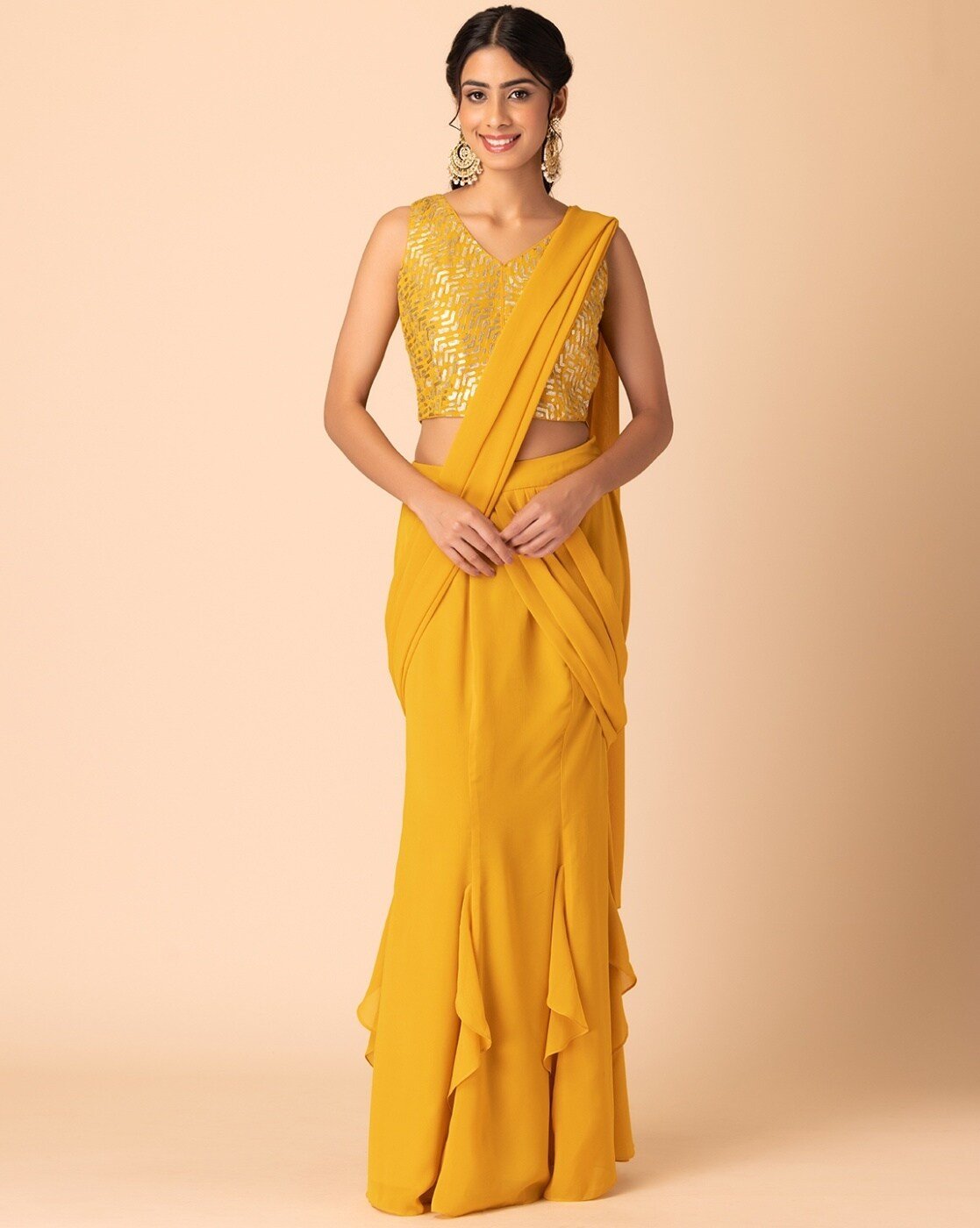Women Embroidered Cape Ready to Wear Saree with Attached Blouse